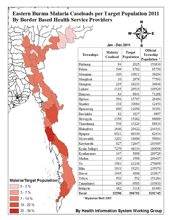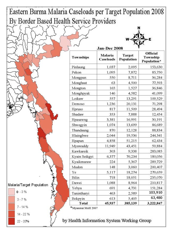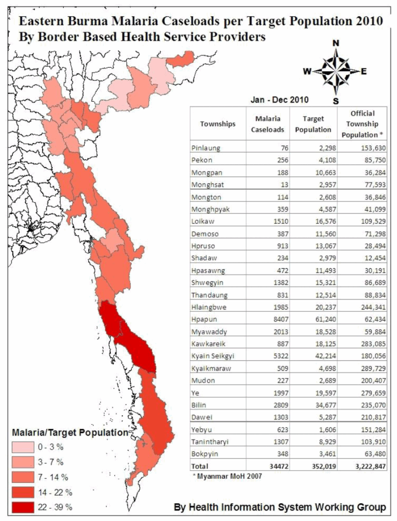 The 2009 HISWG maps and charts present the number of treated cases for major diseases per target population in each township of Eastern Burma, using 2007 official population data from the Myanmar Ministry of Health (included without endorsement due to the lack of updated figures). These visuals reflect the scale of healthcare service provision but do not represent disease prevalence or overall morbidity, as they include only treated cases and may count individuals more than once. Caseload data should be interpreted with caution—low numbers may indicate either low disease rates or limited access to care, while high numbers may still miss untreated cases. The data focuses on relatively stable rural populations and is not representative of the region as a whole.